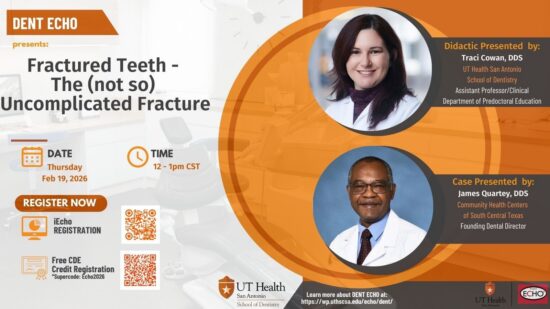 Session summary: In the third session of the DENT ECHO featured didactics on Integrating Dental and Medical Health Care by Dr. Luis Yepes, DDS. This was followed by a case presentation and discussion with Carlos Escobar, DDS AEGD resident at UT Health San Antonio School of Dentistry.