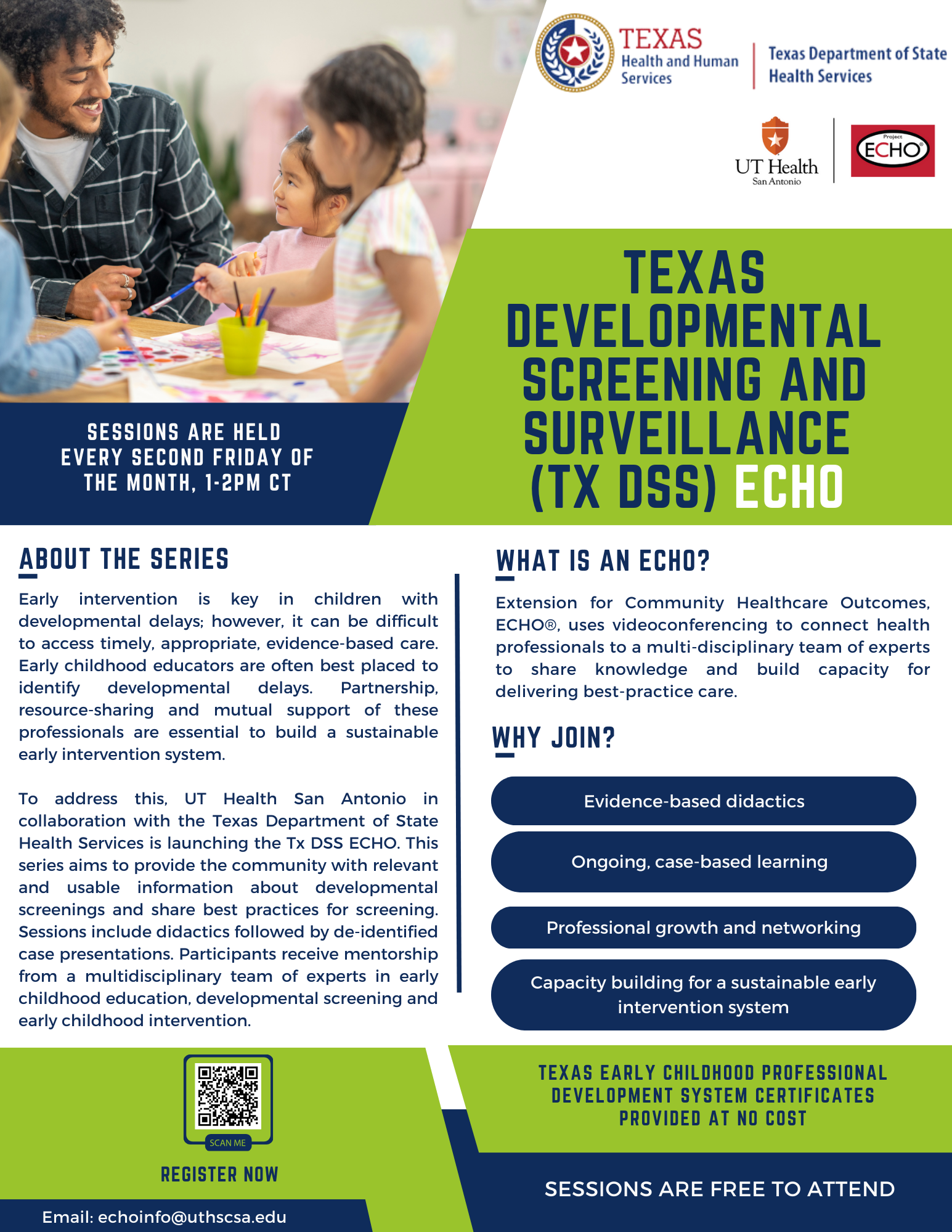 The Tx DSS ECHO connects subject matter experts and early childhood educators to increase their knowledge in developmental screening and early childhood intervention so that they can provide necessary care to children in their communities. UT Health San Antonio is partnering with the Texas Department of State Health Services (DSHS) and experts in the field to implement this ECHO program.