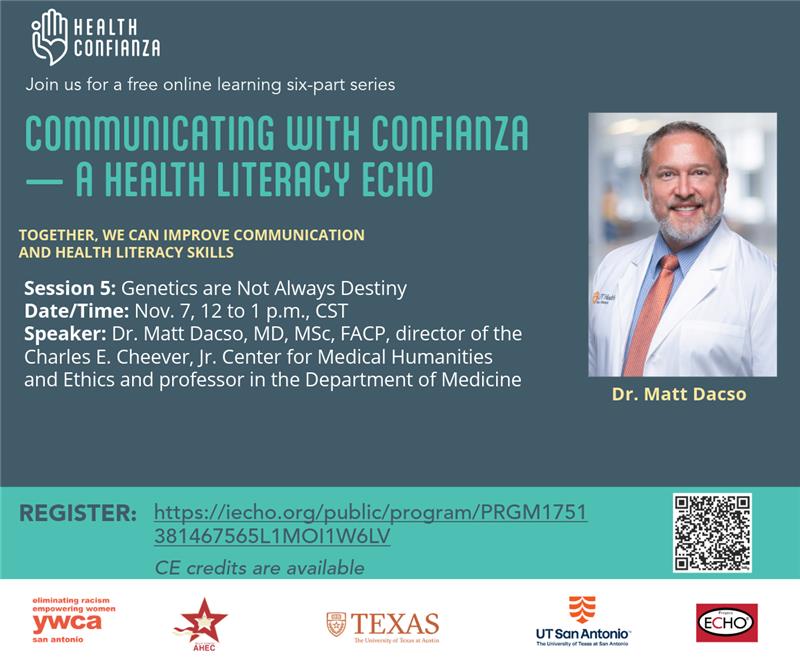 We are launching the Communicating with Confianza — A Health Literacy ECHO in partnership with Health Confianza, a collaboration between UT Health San Antonio ECHO Superhub, YWCA, South Central AHEC, and the University of Texas at Austin to provide health literacy education, training, resources, knowledge-sharing, and workforce development for Bexar County and surrounding areas. We believe health literacy (finding, understanding and using health information to make better health choices) is critical to transform health and achieving health equity for all.