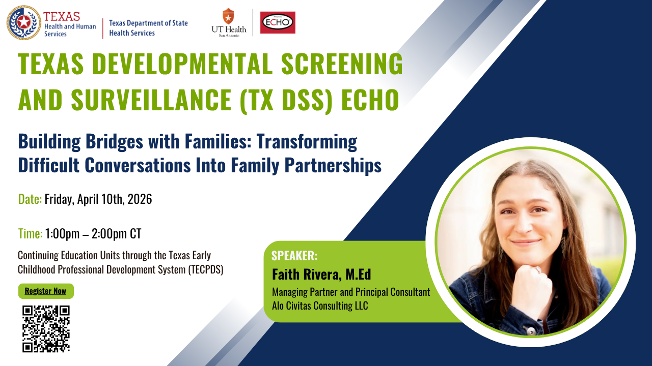 To address this, UT Health San Antonio in collaboration with the Texas Department of State Health Services is launching the Tx DSS ECHO. This series aims to provide the community with relevant and usable information about developmental screenings and share best practices for screening.