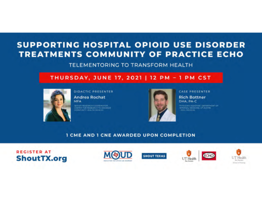 Support Hospital Opioid Use disorder Treatment (SHOUT) Texas is a program at Dell Medical School at The University of Texas at Austin and UT Health San Antonio’s TxMOUD that is working to increase access to substance and opioid use disorder (OUD) treatment and harm reduction during acute hospitalization.