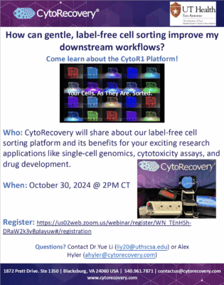 We are inviting you to another exciting seminar on Label-Free Cell Sorting by CytoRecovery. Unlike ThinkCyte that uses light properties of a cell to sort, CytoRecovery sorts cells by applying different frequency sinusoidal waveforms. This seminar will take place on Zoom at 2pm on October 30. Please register through the link on the flyer to get the meeting link. Come find out how label-free sorting can save you time and resources and maintain the health of sorted cells. Hope to see you there.