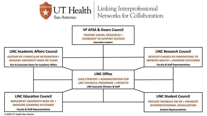 Pictured above, the new LINC organizational model retains three critically important groups: VP AFSA & Deans Council to provide the vision, resources, and oversight to support LINC’s success; the LINC Academic Affairs Council to ensure the sustainability of IPE curricular integration and manage the annual revision and approval processes associated with program-specific IPE Plans; and, the LINC Student Council to strengthen interprofessional socialization across campus and contribute to quality improvement efforts tied to university-wide IPE activities.