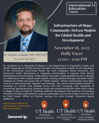 The Campus Internationalization Committee (CIC), along with the Center for Medical Humanities & Ethics and International Services are pleased to have Dr. Michael Goodman, MDiv MPH DrPH as this year's International Education Week keynote speaker for UT San Antonio Health Science Center.